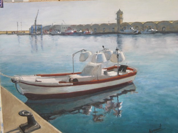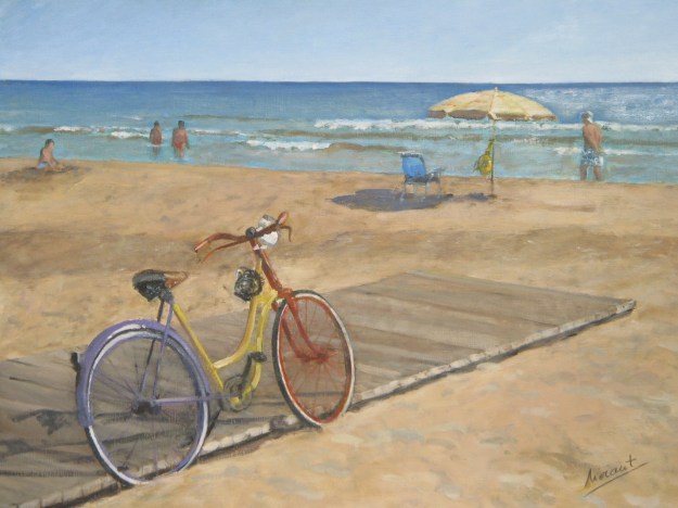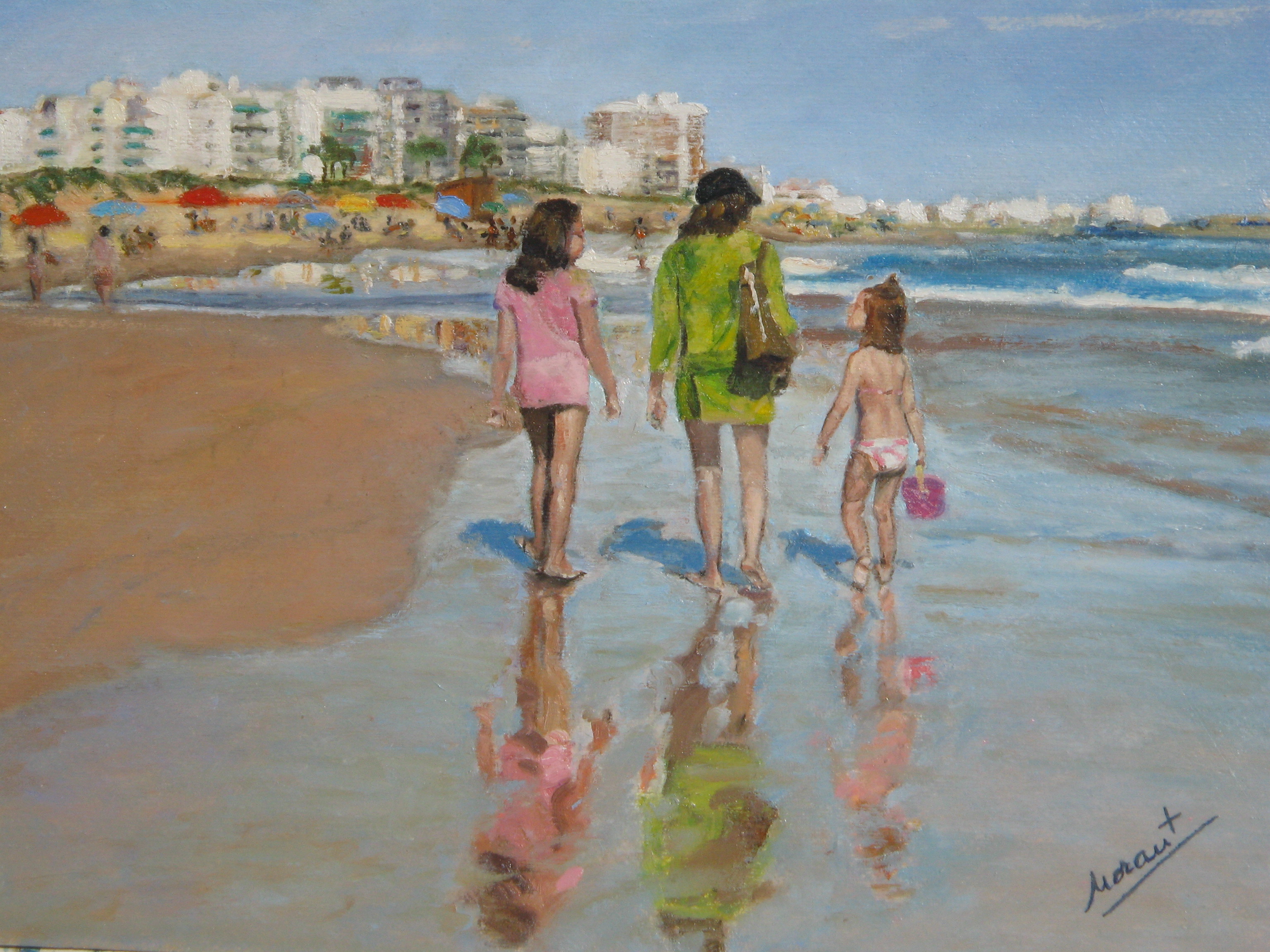 Una joven madre y sus hijas caminan por la orilla mientras cambian impresiones. He querido plasmar el reflejo de sus figuras sobre la arena mojada. También el movimiento de las olas y el color azul del cielo Mediterráneo .
