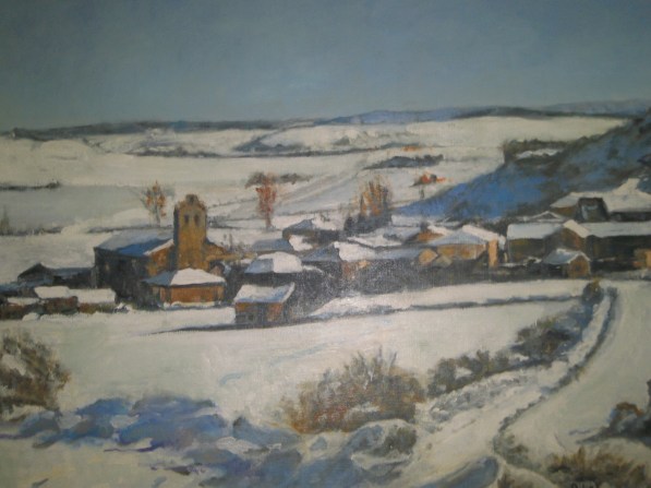 Me hacía ilusión pintar un espacio nevado y ésta es la primera obra en la que me he recreado con esa ilusión. Sombras azuladas entre la blancura de la nieve bañada por el sol; vegetación otoñal y cielo plomizo, convidan a buscar refugio en el interior de las casas.